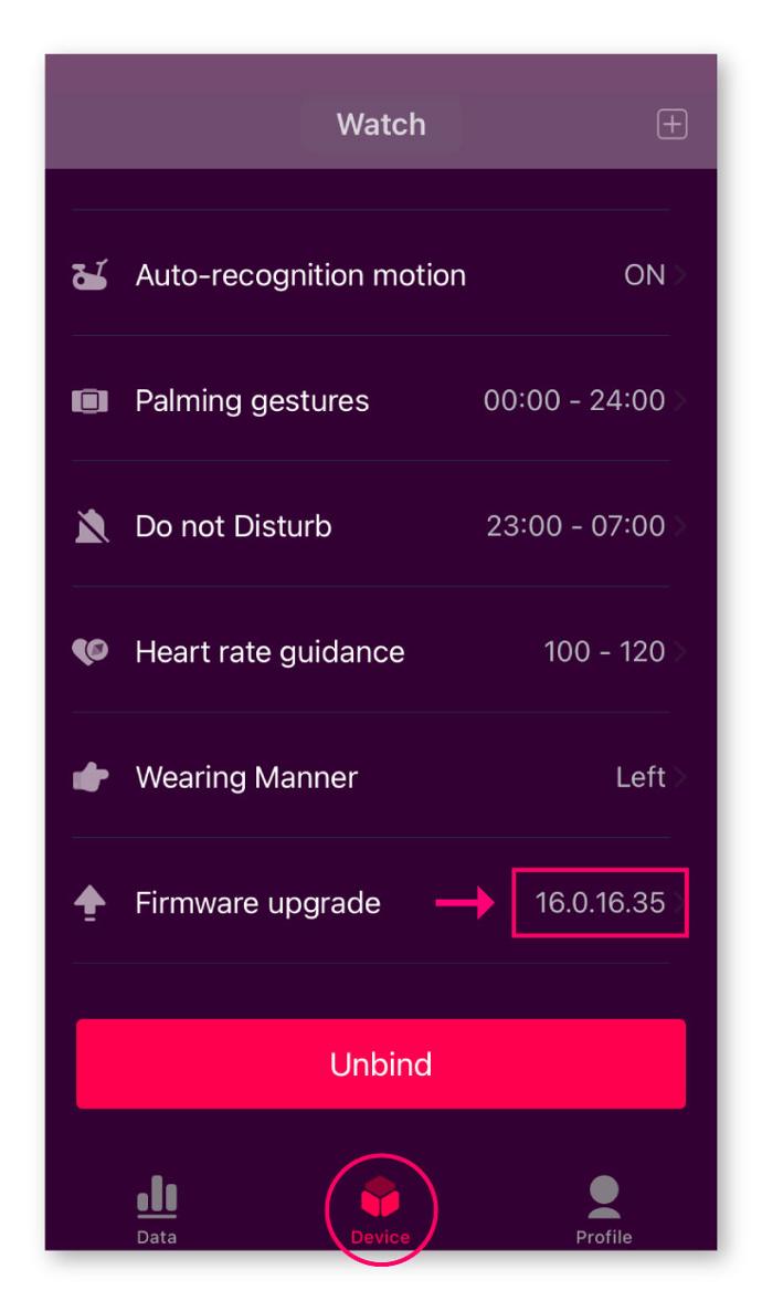You can find this information by going to the Device page of your App. Scroll the page until you read Firmware upgrade. On the right, you can read the current Firmware version of your device.