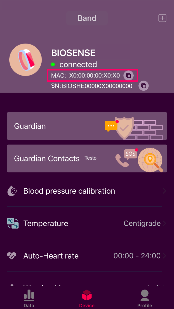 You can find the band bluetooth information on the box of your device, right under the barcode, along with your device SN and MAC address. The bluetooth information should look like this: BIOSENSE-X0000.