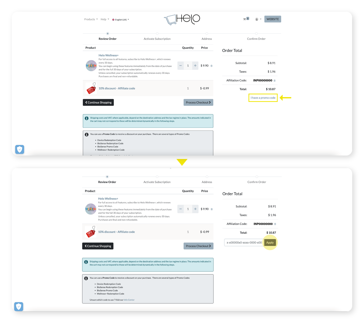 2. On the Checkout page in the payment section, click on "I have a Promo Code" and enter your Wellness+ Redemption Code > "Apply".