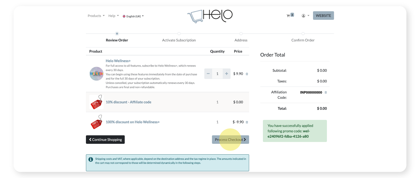 3. Once the code is applied, hit the “Process checkout” button in the lower right corner.