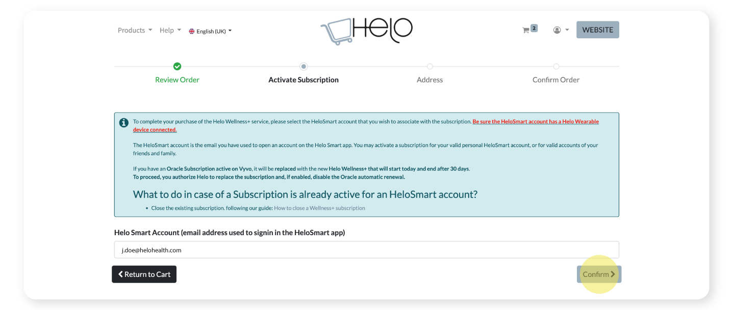 4. Insert the email address of the profile to be tied to the subscription (only accounts that do not yet have an active subscription will be accepted) and Confirm.