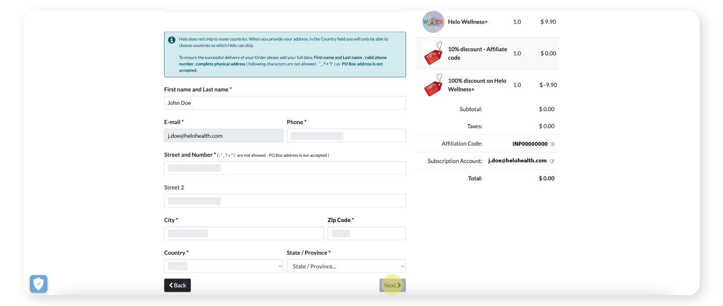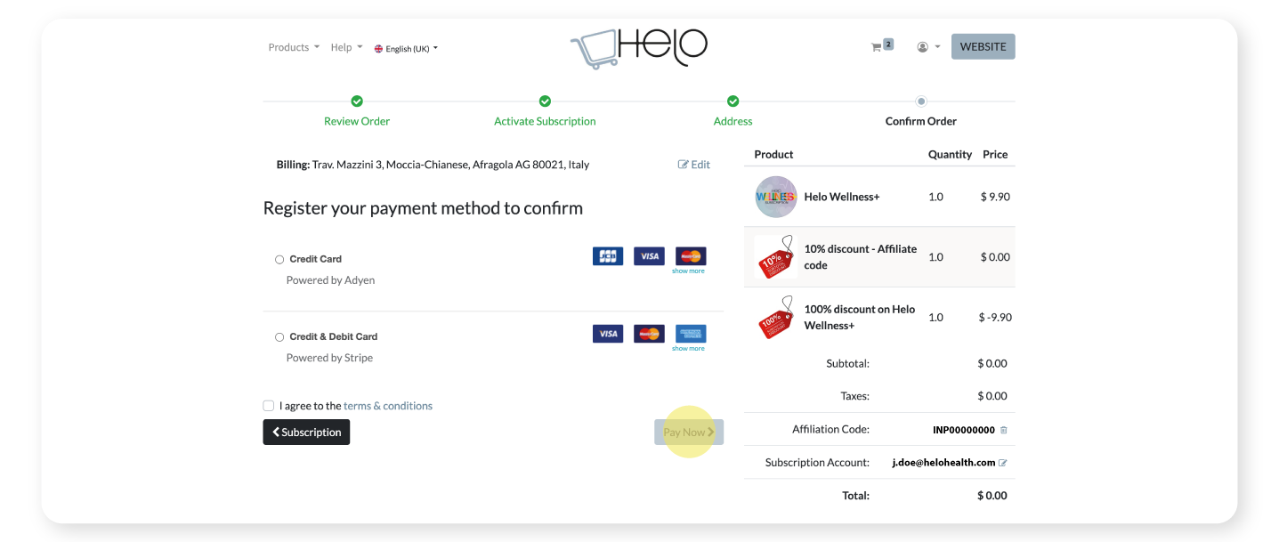 6. Register your payment method (your credit card information will be registered for the renewal of the subscription at the end of the free period) > "Pay now". You will see the Wellness+ Subscription amount deducted from your total order on the right side of the page.