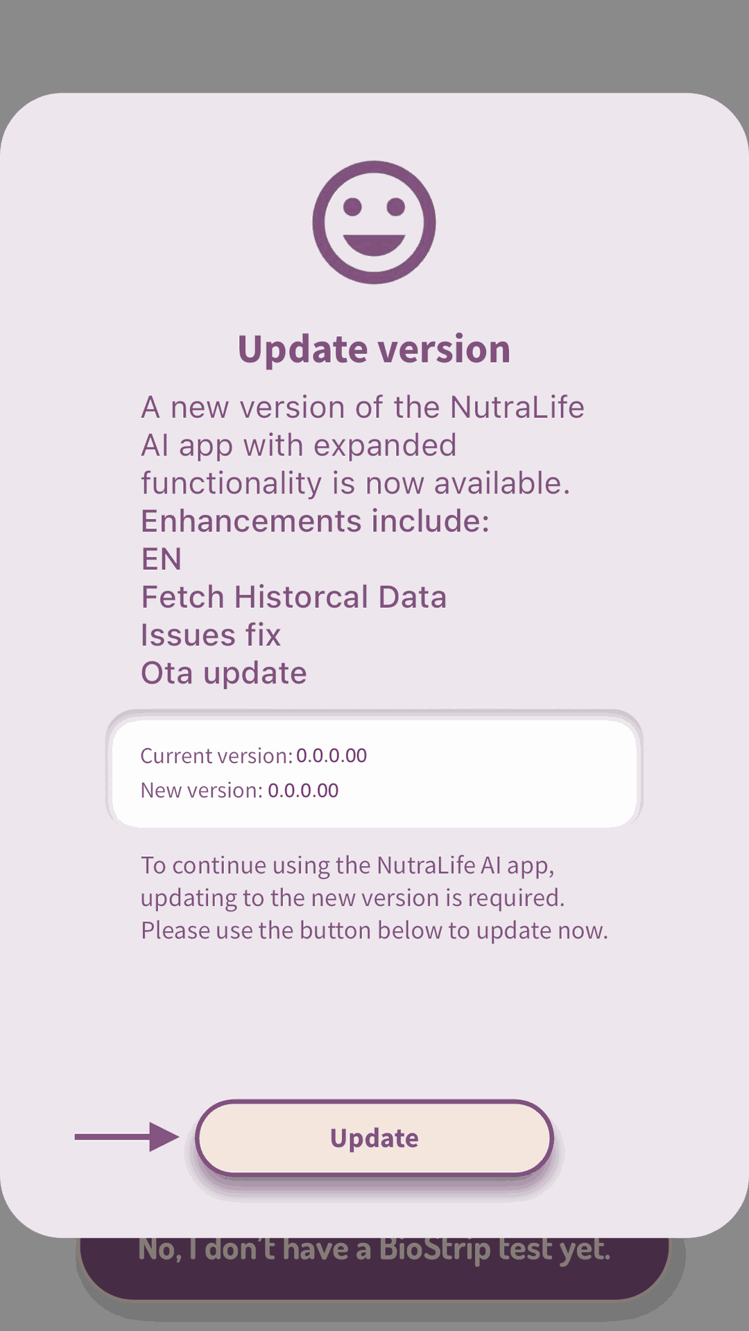 There are two different ways to update the NutraLife AI™ app: OTA (over-the-air) through the App or through the Store.