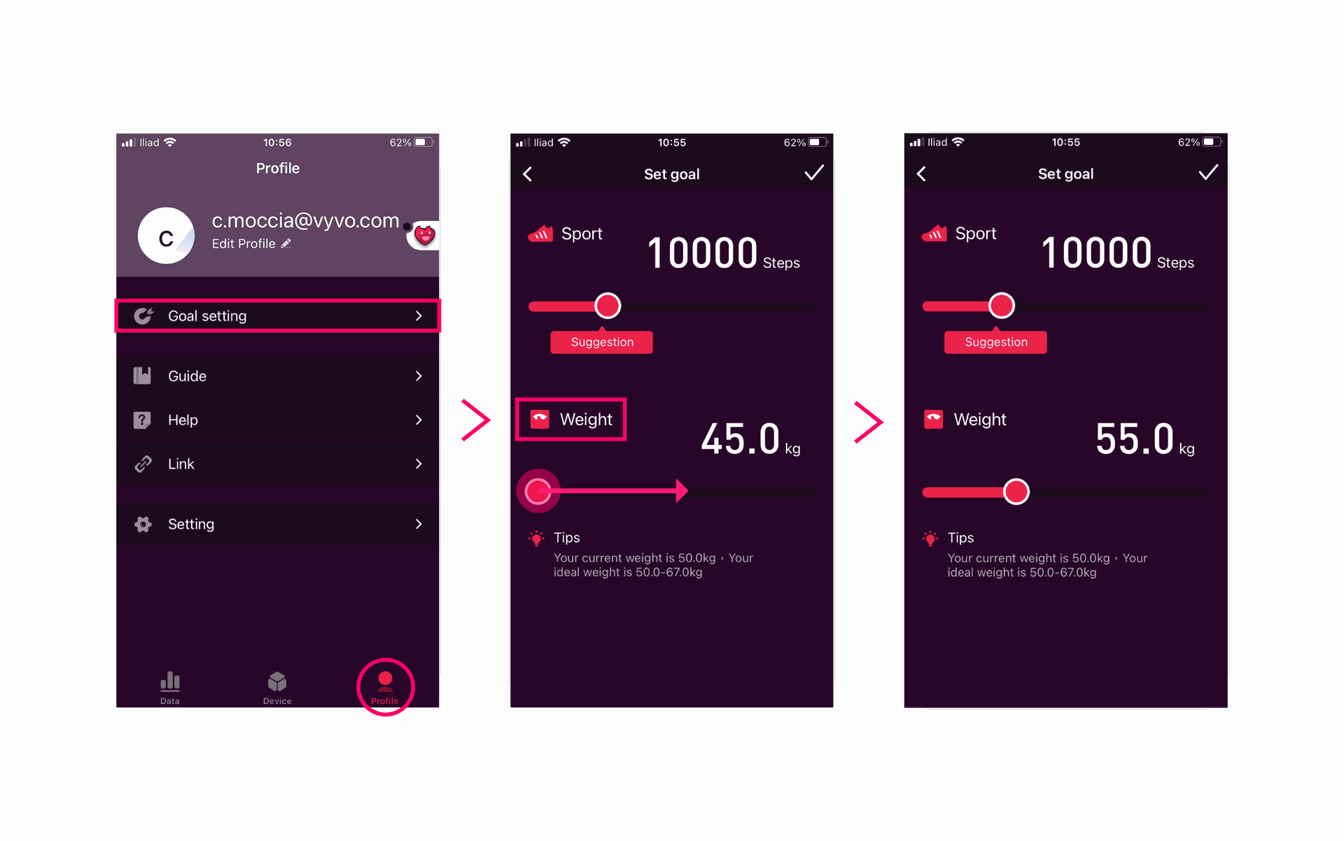 您可以設定每日步數和體重目標,在水平橫槓上滑動即可移動紅色圓圈,以增加或減少步數,以及體重目標的數字