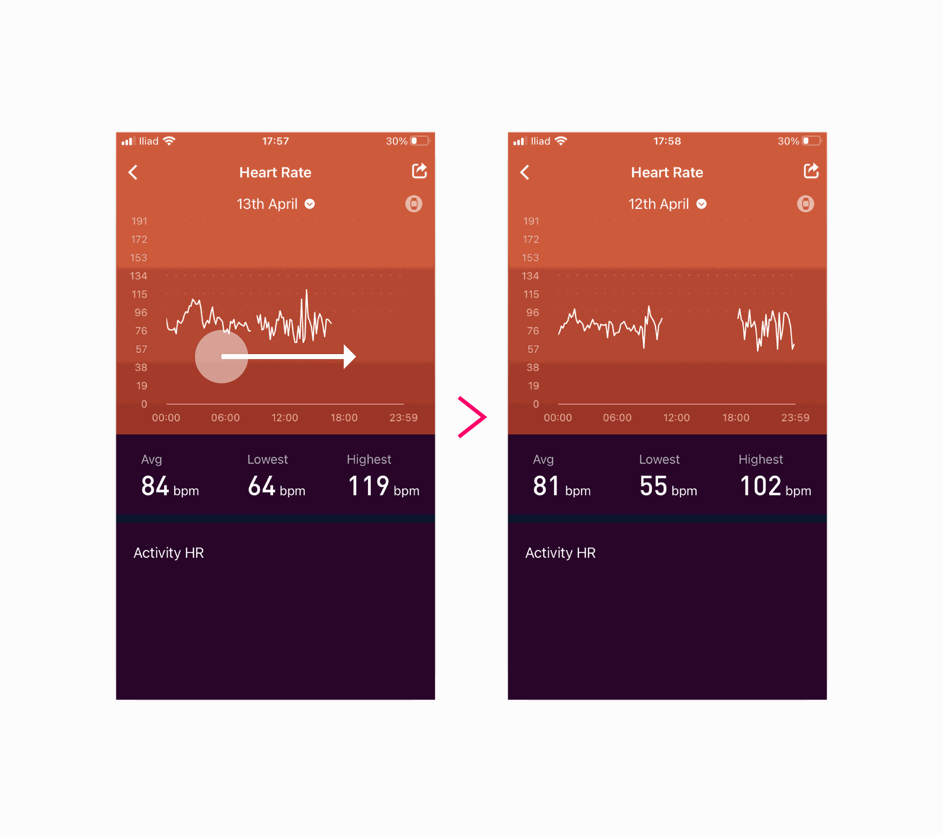 In the upper part of the screen, you will have a diagram showing your heart rate reports day by day. Just slide your finger right on the screen to show all the previous days.