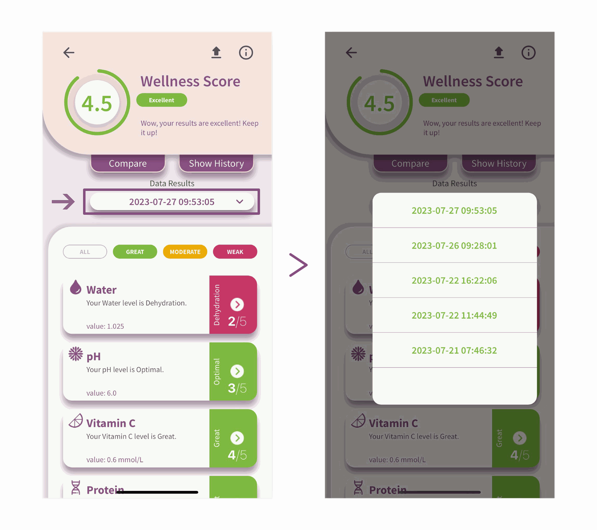 您的所有歷史檢測結果都會儲存在應用程式,隨時可以使用日期列表查看,還可以透過在頁面上點選「很棒」、「中等」或「較弱」按鈕,以過濾並顯示特定結果。