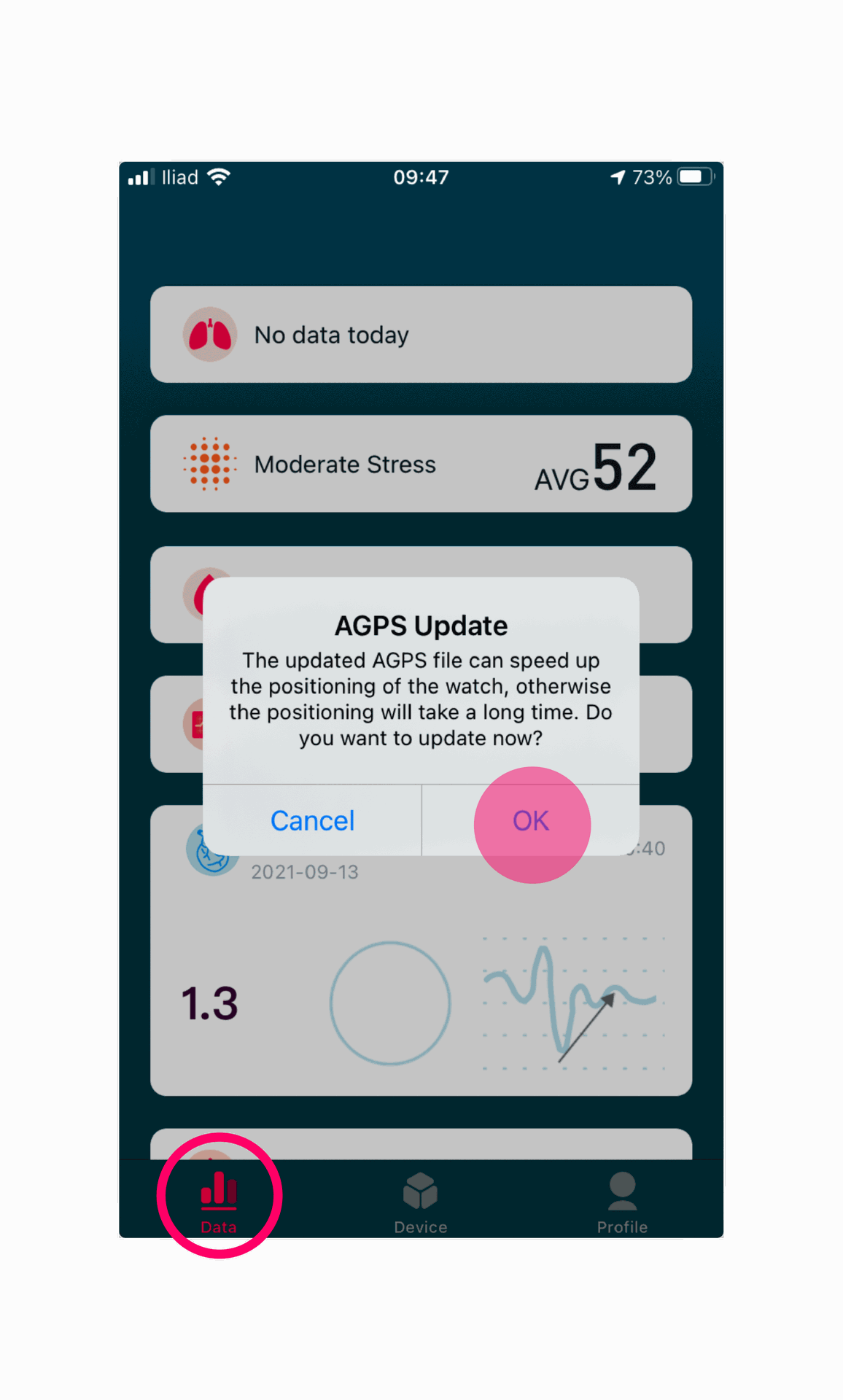 為了加快手錶的定位速度,請根據應用程式中的提示訊息更新 AGPS 功能。